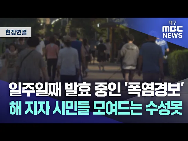 더위는 식을 줄을 모르고 계속 뜨겁습니다. 대구와 경북에는 일주일 넘게 '폭염 특보'가 발효 중인데요. 특히 특보 중 가장 높은 단계인 '폭염 경보' 상태가 계속 이어지고 있습니다. 오늘 아침에는 21도에서 27도 분포로 경북 동해안 일부 지역에서는 열대야 기준을 넘어섰고요. 낮에는 오늘도 35도에서 36도까지 치솟으며...