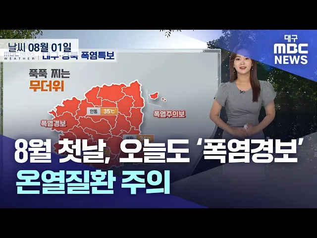 대구·경북 전역에 일주일째 폭염경보가 내려진 가운데 8월 첫날인 1일도 매우 무덥겠습니다.화요일 낮 최고 기온은 대구·경산 36도, 안동 35도 등 32~36도까지 오르겠고 습도가 높아 체감온도는 더 높겠습니다. 밤에도 최저 기온이 25도를 웃도는 열대야가 나타나는 곳이 많겠습니다. 수요일은 아침 최저 기온이 21~25도, ...