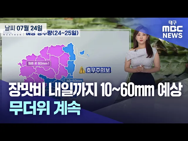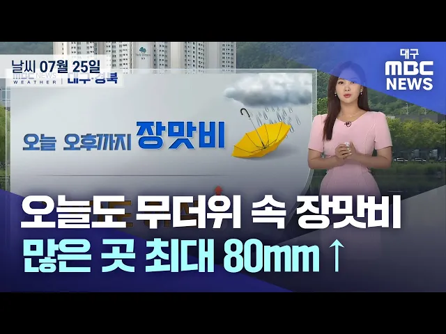 7월 25일 대구·경북 지역은 무더위 속에 오후까지 곳에 따라 강한 비가 내리겠습니다.예상 강수량은 대구와 경북 내륙, 북동 산지 10~60mm, 북부 내륙 등 80mm 이상입니다.오후까지 경북 북부 내륙을 중심으로 돌풍과 천둥, 번개를 동반한 시간당 30mm 이상의 강한 비가 오는 곳이 있겠습니다.25일 낮 최고 기온은 대구 31...