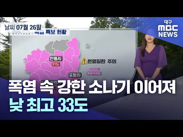 대구와 경북 대부분 지역에 폭염주의보가 내려진 가운데 일부 지역에는 강한 비가 쏟아졌습니다.화요일인 7월 25일 낮 최고기온은 대구 32.2도, 포항 33.8도, 구미 31도 등 28도에서 33도의 분포를 보였고 습도가 높아 최고 체감온도는 더 높았습니다.호우 특보가 내려진 경북 서북부 내륙지역으로는 많은 비가 내렸습니다....