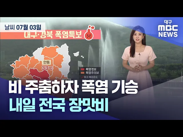 7월 첫 월요일인 7월 3일 한낮 체감온도가 35도까지 치솟으며 덥겠습니다.현재 대구와 칠곡, 의성에는 폭염 경보가, 북부 동해안을 제외한 그 외 대구·경북 전역에는 폭염주의보가 발효 중입니다.낮 최고 기온은 대구 34도, 안동 33도 등 25~34도의 분포를 보이겠고 습도가 높아 체감온도는 더 높겠습니다.화요일은 정체전...