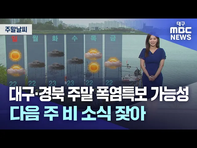 7월 1주 차 대구·경북 '날씨 체크' 시작합니다.이번 주는 '폭염'과 '장마'가 모두 찾아옵니다. 전국에 장맛비가 집중되는 시기는 화요일과 수요일이고요. 수요일 오전에는 대부분 그치겠습니다. '폭염'에 '장마'까지 이번 주는 평년보다 높은 기온 이어지는 가운데 날씨가 정말 요란하겠습니다.우리 지역 평년 최저 기온은 ...