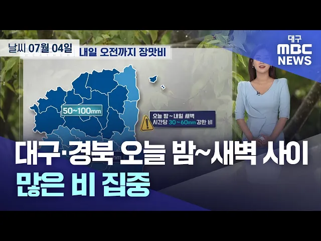 어제는 폭염이 심했는데 오늘은 하늘이 심상치 않습니다.오늘 오전부터 내일 오전 사이 장맛비가 내리겠는데요. 경북 남서 내륙부터 비가 시작돼 오후에는 대구와 그 밖의 경북 대부분 지역으로 비가 내리는 지역이 확대되겠고요. 특히, 경북 북부 내륙을 중심으로 돌풍과 함께 천둥, 번개를 동반해 시간당 30~60mm의 매우 ...