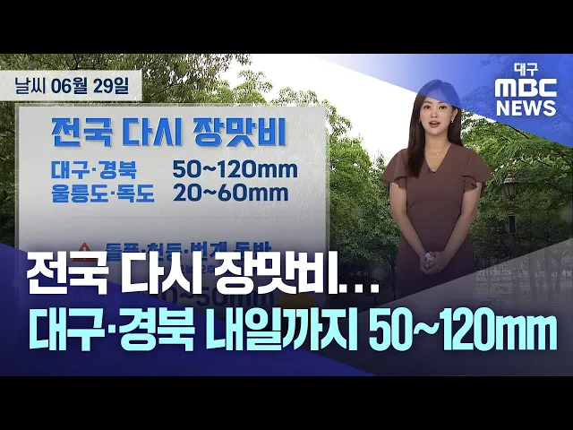 목요일인 6월 29일 대구와 경북 지역은 무더위 속에 다시 많은 장맛비가 내리겠습니다.예상 강수량은 금요일까지 50~120mm입니다. 돌풍이 불고 천둥·번개가 치면서 시간당 30~50mm의 매우 강하고 많은 비가 쏟아지겠습니다.경북 북부는 금요일 늦은 오후까지, 대구와 경북 남부는 토요일 새벽까지 비가 이어지겠습니다.목요...