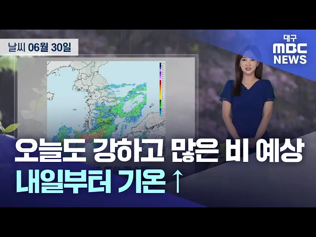 대구와 경북 지역은 정체전선의 영향으로 약한 비가 계속 내리고 있습니다. 경북 북동 산지와 영주, 봉화, 울진에는 호우주의보가 계속 발효 중입니다. 경북 북부에는 금요일인 6월 30일 밤까지, 그 밖의 대구·경북 지역에는 토요일 새벽까지 20~60mm의 비가 더 오겠고, 돌풍이 불고 천둥·번개가 치는 곳도 있겠습니다. 전...