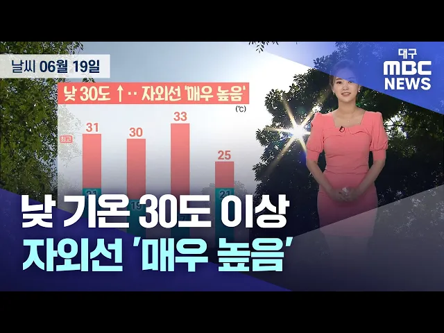 6월 19일 대구·경북 지역은 대체로 맑은 가운데 더운 날씨가 이어지겠습니다.낮 최고 기온은 대구 31도, 경산과 청도 30도, 칠곡 32도 등 24도에서 33도로 전날보다 1~4도가량 낮겠습니다.한낮 자외선 지수는 '매우 높음', 오존 농도는 '나쁨' 수준을 보이겠습니다.20일은 대체로 흐린 가운데 밤부터 대구와 경북 남부 지역...