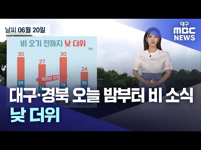 월요일인 6월 19일 대구와 경북 지역은 대체로 맑은 가운데 더위가 이어졌습니다.낮 최고 기온은 대구 30.2도, 상주 33.5도, 구미 32.3도 등 동해안을 제외한 대부분 지역이 30도를 웃돌았습니다.화요일은 대체로 맑다가 오후부터 흐려지겠고, 밤부터 대구와 경북 남부에 비가 내리겠습니다.비는 수요일까지 이어지겠고, 예...