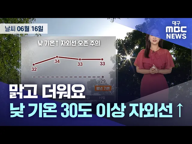 금요일인 6월 16일, 대구와 경북 지역은 맑은 가운데 한낮 기온이 30도를 훌쩍 웃돌며 덥겠습니다.6월 16일 아침 최저 기온은 대구 17.2도, 안동 15.4도, 포항 18.4도 등이었습니다.낮 최고 기온은 대구 32도, 경산·성주 33도 등 26~33도의 분포로 전날보다 3~4도가량 높겠습니다.미세먼지와 초미세먼지 농도는 '보통'에서 ...