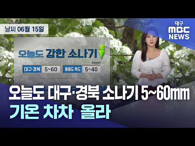 6월의 소나기가 정말 요란합니다.어제 세찬 소나기의 영향으로 대구를 포함해 경북 일부 지역에는 '호우주의보'가 발효되기도 했는데요. 폭우와 함께 우박이 떨어지는 곳도 있었습니다. 오늘도 대기 불안정이 이어지며 소나기가 내리겠습니다. 오전부터 저녁 사이 대구와 경북에는 5~60mm 예상되고요. 울릉도와 독도는 오늘...