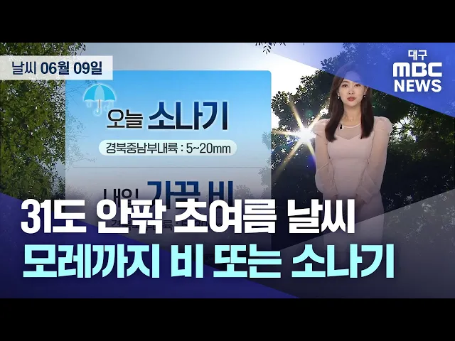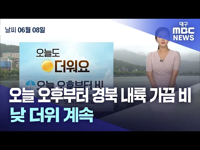 목요일인 6월 8일도 대구와 경북 지역에 초여름 날씨가 이어진 가운데, 경북 남서 내륙에 소나기가 내리는 곳이 있겠습니다.비는 금요일 새벽까지 이어지겠고, 예상 강수량은 5~20mm입니다.낮 최고 기온은 대구 29.3도, 구미 29.5, 안동 30.6도 등으로 평년보다 2도가량 높았습니다.금요일은 대체로 흐리다 오전부터 차차 ...