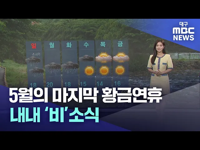 5월의 마지막 연휴를 앞두고 하늘이 심술입니다. 오늘부터 '부처님오신날' 연휴 기간 내내 비가 내리겠는데요. 오늘(26일)도 대구와 경북에는 아침까지 빗방울이 떨어지는 곳이 있겠고요. 대기 불안정의 영향으로 오늘 오후에도 대구와 경북내륙에는 소나기가 내릴 것으로 예상됩니다. 내일도 갑작스러운 소나기는 계속 이...