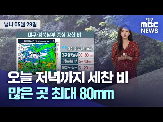 일요일인 5월 28일, 대구와 경북 지역은 종일 흐리고 비가 왔습니다.이 비는 30일 새벽까지 이어지겠고 예상 강수량은 30~80mm, 경북 서부 내륙과 남부 동해안에는 최대 100mm 이상 쏟아지는 곳도 있겠습니다.대체공휴일인 29일도 흐리겠고 아침부터 오후 사이에는 강한 비가 오는 곳이 많겠습니다.29일 아침 최저 기온은 ...