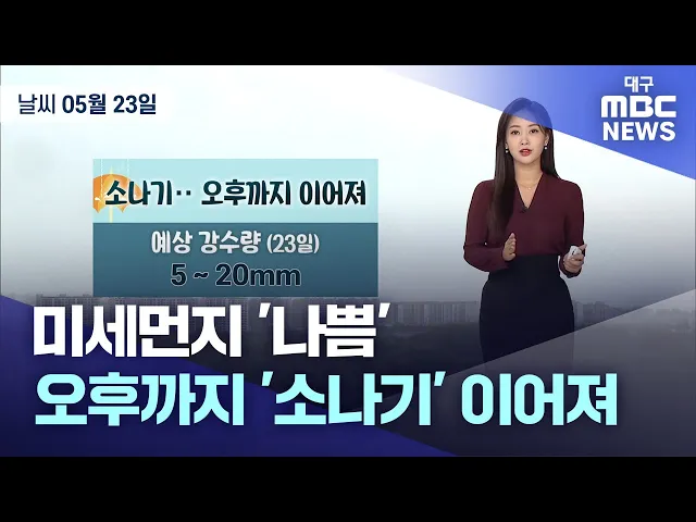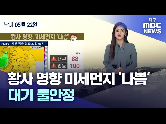 월요일인 5월 22일, 대구와 경북 지역은 흐린 가운데 황사의 영향으로 대기질이 매우 나쁘겠습니다.오전부터 낮 사이 가끔 빗방울이 떨어지는 곳이 있겠고, 경북 북부 내륙에는 늦은 오후부터 돌풍과 천둥·번개를 동반한 소나기가 오는 곳이 있겠습니다.예상 강수량은 경북 북부 내륙에 5mm 안팎, 그 밖의 대구·경북에 0.1m...