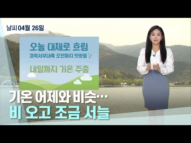 4월 26일 대구와 경북 지역은 대체로 흐리다가 오후부터 차차 맑아지겠습니다.경북 서부 내륙에는 오전에 빗방울이 떨어지는 곳이 있겠습니다.낮 최고 기온은 대구와 포항 20도, 안동 17도 등 15도에서 20도로 전날보다 5도에서 7도가량 높겠습니다.대기 중 미세먼지 농도는 대구 보통 수준, 경북 좋음 수준을 보이겠습니다...