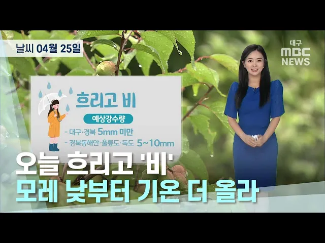4월 25일 대구와 경북 지역은 흐리겠고, 아침부터 밤사이 5mm 미만의 비가 내리겠습니다.낮 최고 기온은 대구와 포항 13도, 안동 10도 등 9도에서 13도로 전날보다 5도가량 낮겠습니다.미세먼지와 초미세먼지 농도는 좋음 수준을 보이겠습니다.대구지방기상청은 비가 내리는 지역에서는 가시거리가 짧고 도로가 미끄러운 곳...
