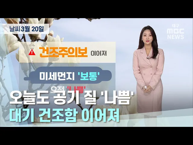 월요일인 3월 20일, 대구와 경북 지역은 가끔 구름이 많고 건조하겠습니다.3월 20일 아침 최저 기온은 대구 2.7도, 포항 6.5도, 안동 영하 0.4도 등이었습니다.대구·경북 전역에는 일주일 넘게 건조주의보가 발효 중입니다.미세먼지와 초미세먼지 농도는 '보통' 수준이 예보됐고, 대기 정체로 오전 한때 '나쁨' 수준을 보이...