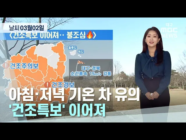대구와 경북은 맑은 가운데, 3월 2일 낮 12시를 기해 대부분 지역에 건조특보가 내려졌습니다.낮 최고기온은 대구, 구미 10도, 안동, 포항 9도로 평년과 비슷하겠습니다. 3일도 대체로 맑겠고 대구의 아침 최저기온 영하 2도 등 영하 7도에서 영상 1도, 낮 최고기온은 대구 16도 등 11도에서 16도로 2일보다 기온이 5도 이...
