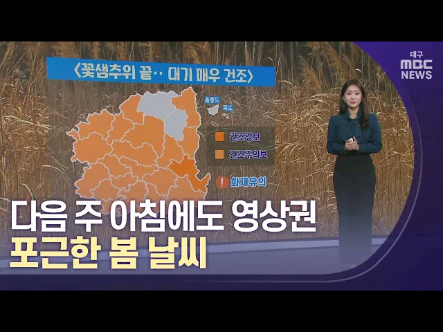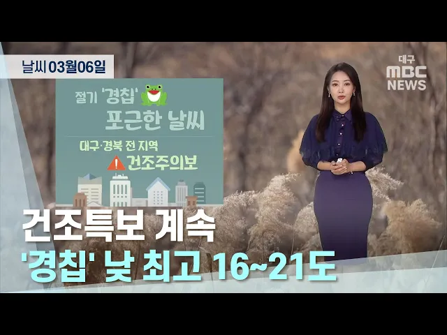 오늘은 개구리가 겨울잠에서 깨어나는 절기 '경칩'입니다.봄의 세 번째 절기 답게 오늘도 날이 포근하겠는데요. 다만 대기의 건조함도 극심합니다. 현재 대구와 경북 전 지역에 '건조주의보'가 발효 중이고요. 대구에도 일주일 넘게 대기의 메마름이 심해지며 지난 토요일 앞산에서 산불이 발생하기도 했습니다. 당분간 뚜...