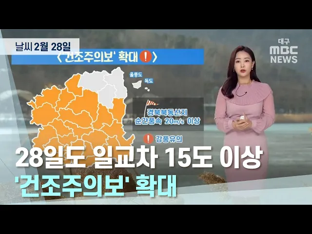 2월 28일 대구·경북 지역은 밤부터 차차 흐린 가운데 대기가 건조하고 바람도 많이 불겠습니다.현재 봉화와 영양 평지를 제외한 대구·경북 전역에 건조주의보가, 경북 북동 산지와 영덕, 울진에는 강풍 주의보가 발효 중입니다.28일 낮 최고 기온은 대구 18.1도, 안동 14.6도, 경주가 18.6도까지 오르며 일교차는 15도 이상...