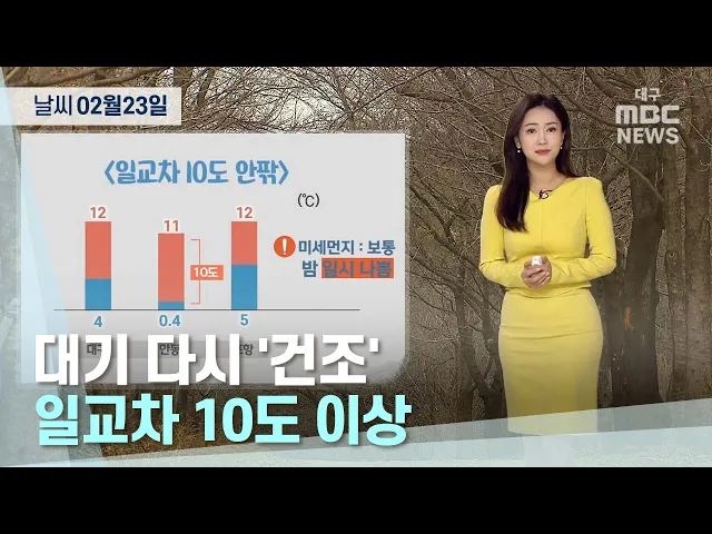 대구와 경북 지역은 대기가 매우 건조한 가운데 밤부터 차차 흐리겠습니다.현재 대구와 경북 구미, 포항에 건조주의보가 발효 중입니다. 2월 22일 낮 최고 기온은 대구 11.1도, 구미 10.9도 안동 9.3도 등 8~12도로 21일보다 5도가량 높았습니다.대구와 경북 남부 지역에는 밤부터 23일 새벽 사이 빗방울이 떨어지거나 눈이...