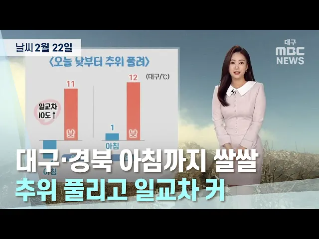 2월 3주 차 대구·경북 ‘날씨 체크’하고 가세요.바로 ’맑음’입니다. 2월 20일은 아침부터 영하권 보이며 쌀쌀하게 시작했습니다. 지난주에 워낙 포근했던 터라 더 춥게 느껴졌는데요. 이번 반짝 추위는 수요일 아침까지 이어지다 목요일부터 점차 기온이 오르겠습니다.2월 3주 차 우리 지역 평년 최저 기온은 -4도에서 3도, ...