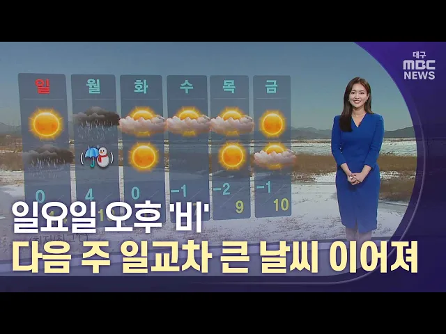 대구와 경북 지역은 종일 흐리겠습니다. 경북 북부에 내려졌던 대설주의보는 모두 해제됐고, 다만 늦은 오후까지 5mm 안팎의 비와 1cm 미만의 눈이 내리겠습니다.2월 10일 낮 최고 기온은 대구·안동 9도, 등 8~11도의 분포로 전날과 비슷하겠습니다.주말인 11일은 구름이 많겠고 아침 최저 기온은 대구 0도 등 영하 7도에서...