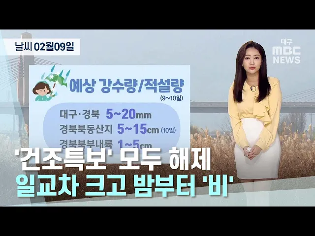 답답하고 건조했던 대기에 반가운 비 소식이 있습니다.2월 9일 밤부터 대구와 경북 남부, 경북북서내륙을 중심으로 비 또는 눈이 시작되겠고요. 그 밖의 경북 북부로는 10일 새벽에 확대될 전망입니다. 10일까지 예상 강수량은 대구와 경북에 5~20mm고요. 기온이 낮은 경북 북동 산지에는 5~15cm, 경북 북부 내륙에는 1~5cm...