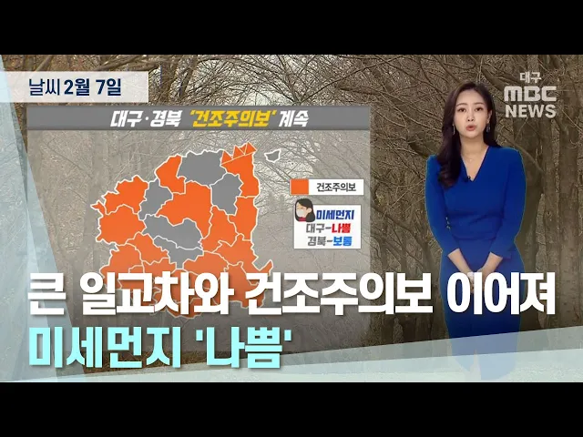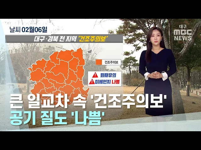 보름달과 함께한 정월대보름 잘 보내셨나요?한 주의 시작인 2월 6일은 대기의 '건조함'이 계속 문제입니다. 현재 대구와 경북 전 지역에 '건조주의보'가 발효 중인 가운데 한 달 가까이 건조함이 이어지며 지역 곳곳에서 크고 작은 화재 사고가 자주 발생하고 있습니다. 대구에는 6일 오전 9시까지 화재위험 경보 '경계' 단...