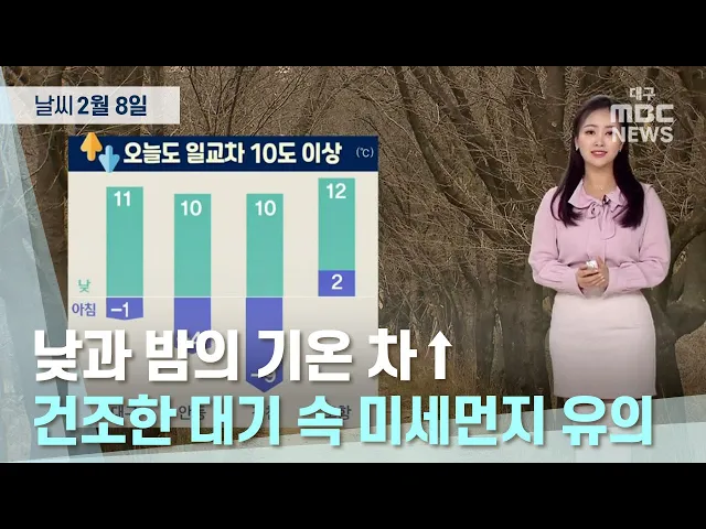 대구와 경북 지역은 대기가 매우 건조한 가운데 구름이 많고 일교차가 크겠습니다.2월 6일 아침 최저 기온은 대구 영하 4.7도, 안동 영하 8.2도, 김천 영하 11.9도 등 영하 12도에서 영상 1도의 분포를 보였습니다.낮 최고 기온은 대구 12도 등 10~14도까지 오르며 평년보다 5~6도가량 높겠습니다.대구·경북 전역에는 닷새...