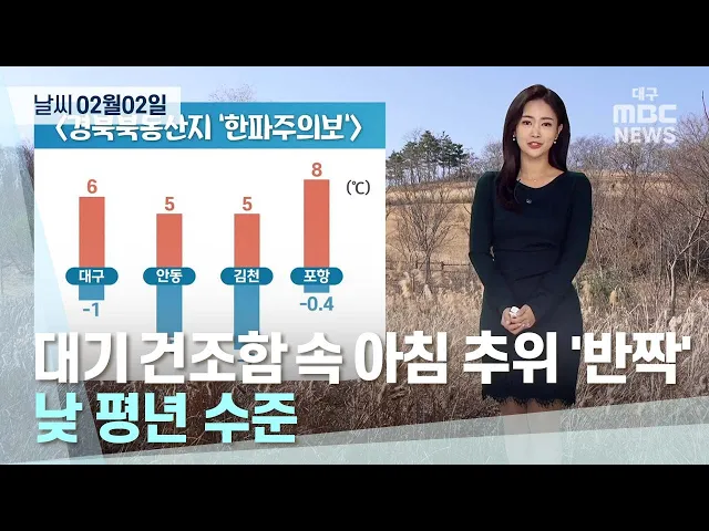 대구와 경북지역은 2월 2일 구름 많겠습니다. 2일 아침 최저기온은 대구 영하 1.7도, 구미 영하 2.9도, 안동 영하 6.6도, 포항 영하 0.6도로 추웠습니다. 낮 최고기온은 대구, 구미 6도, 안동 5도, 포항 8도로 평년과 비슷하겠습니다.포항, 경주, 울진, 영덕에는 건조주의보가 발효 중입니다. 3일은 구름 많다가 오후부터 ...