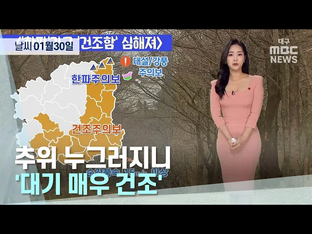 지난주까지 코끝이 매섭던 '냉동고 한파'의 기세가 약해졌습니다.'한파특보'도 기온이 낮은 경북 북동 산지를 제외하고 모두 해제가 되었는데요. '한파'가 물러가니 '건조함'이 문제입니다. 현재 대구와 경북 동해안과 경북 남부 내륙을 중심으로 '건조주의보'가 발효 중이고요. 1월 30일 우리 지역 바람도 순간풍속 15m/s ...