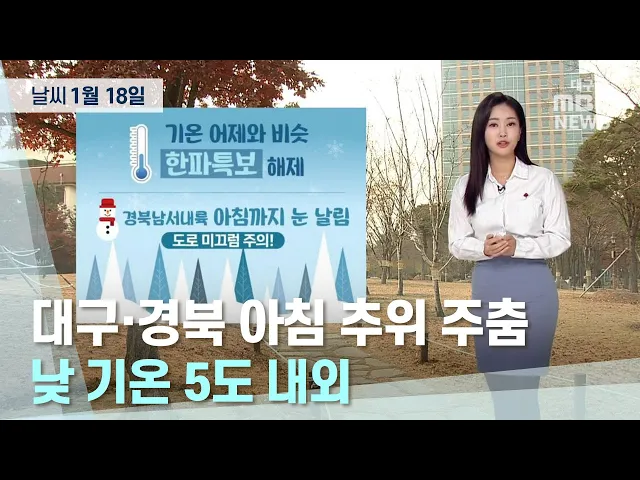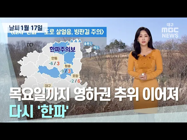월요일과 동시에 강추위가 찾아왔는데 그래도 수요일인 오늘 더 추워지진 않았습니다.현재 '한파 특보'는 모두 해제가 되었고요. 경북북부내륙과 울릉도, 독도에는 눈이 쌓여 있는 가운데, 밤사이 영하의 기온에 눈이 얼어 도로가 매우 미끄럽습니다. 한편 경북남서내륙에는 수요일 아침까지 눈이 날리는 곳이 있겠는데요. ...