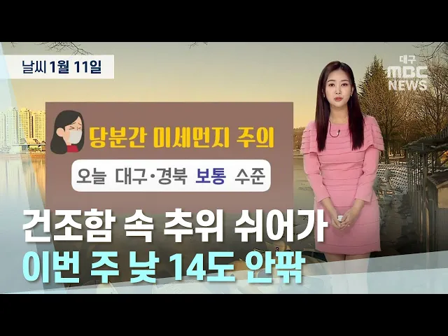 대구와 경북지역은 대체로 맑은 가운데 포근하겠습니다. 1월 11일 낮 최고기온은 대구 13도, 구미 12도, 안동 10도, 포항 14도로 평년보다 7도가량 높겠습니다. 미세먼지 농도는 대구·경북 모두 '보통' 수준으로 예보됐습니다. 목요일도 대체로 맑겠고, 낮에는 수요일보다 기온이 더 오르며 초봄에 가까운 날씨를 보이겠습...