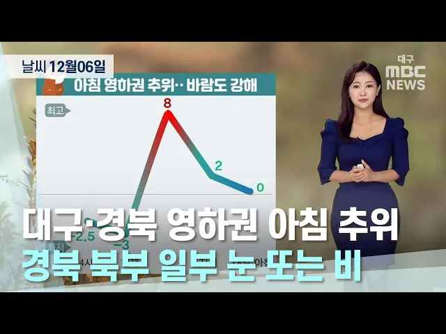 대구와 경북 지역은 가끔 구름이 많은 가운데 아침 기온이 영하권으로 떨어지며 매우 춥겠습니다.12월 6일 아침 최저 기온은 대구 영하 3.7도, 안동 영하 7도, 김천이 영하 10.6도를 기록하는 등 영하 1도에서 영하 11도의 분포를 보였습니다.경북 북부 내륙에는 아침부터 낮 사이 눈이 날리거나 빗방울이 떨어지는 곳이 있...