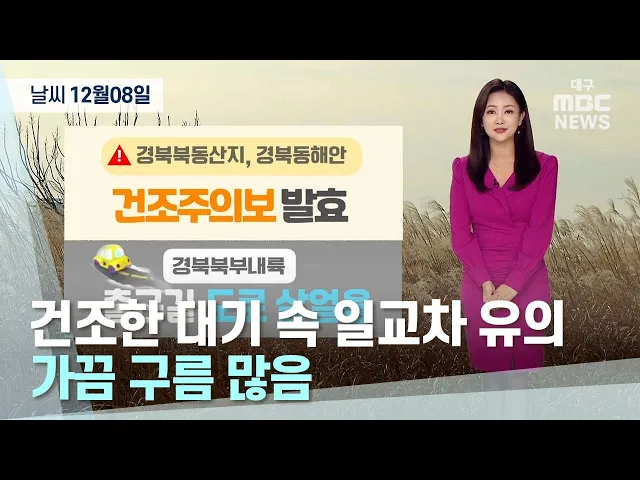 쌀쌀한 추위는 조금 잦아들었지만, 대기는 계속 메말라가고 있습니다.특히 경북 북동 산지와, 경북 동해안 지역을 중심으로 12월 8일도 '건조주의보'가 이어지며 대기가 매우 건조합니다. 대구와 경북 내륙에서도 건조한 대기 속 산불이 나지 않도록 각별히 유의하시기 바랍니다. 출근길 경북 북부 내륙에는 7일 내린 비가 ...