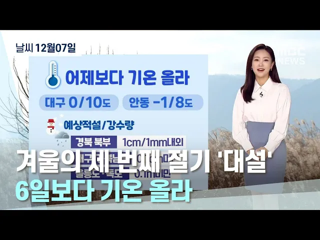 12월 7일은 일년 중 눈이 가장 많이 내린다는 절기 '대설'입니다.우리 지역에 큰 눈 소식은 없겠고요. 기압골의 영향으로 오전까지 경북 북부 내륙을 중심으로 1mm의 비나 1cm의 눈이 오는 곳이 있겠고요. 대구, 경북 남부내륙, 울릉도와 독도에도 빗방울이 떨어지거나 눈이 날리는 곳이 있겠습니다. 12월 7일 아침 대구의 ...