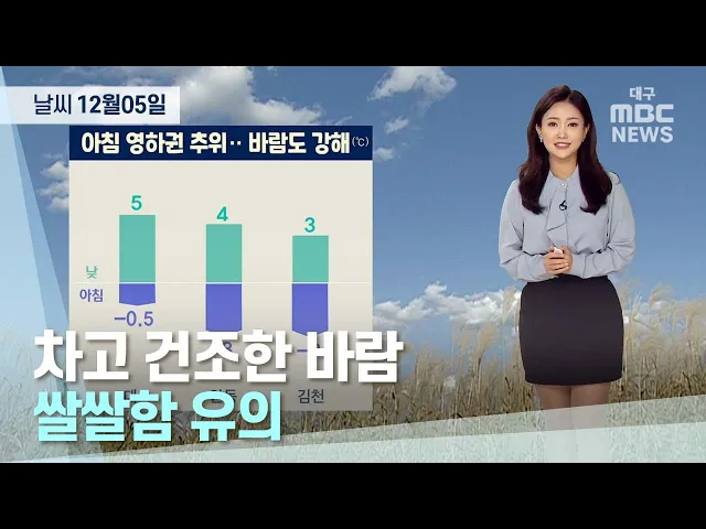 대구와 경북 지역은 대기가 매우 건조한 가운데 바람이 불며 춥겠습니다.12월 5일 낮 최고 기온은 대구 5도, 안동 4도 등 2~7도의 분포로 4일보다 1도가량 낮겠습니다.대구와 구미, 경산 등 경북 일부 내륙과 동해안에는 건조주의보가 발효 중입니다.6일도 가끔 구름이 많은 가운데 아침 기온이 영하권으로 떨어지고 일교차...