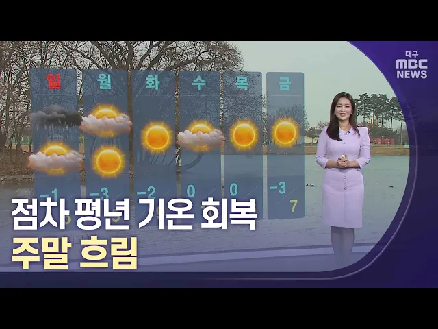 토요일인 3일 대구 경북은 대체로 흐린 가운데 낮부터 평년 기온을 회복하겠습니다.3일 낮 최고기온은 대구 11도, 안동 7도, 포항 12도 등 6도에서 13도의 분포를 보이겠습니다.일요일인 4일은 북서쪽에서 찬 공기가 내려오며 5일까지 기온이 다시 평년보다 낮아지겠습니다.바람도 약간 강하게 불면서 아침에는 체감온도 영...