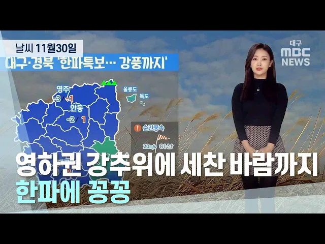 11월의 마지막 날 찬바람이 뼛속까지 파고들고 있습니다.북서쪽에서 내려오는 찬 공기의 영향으로, 하루 사이 기온이 15도 이상 급격히 떨어지면서, 현재 대구와 경북 전 지역에 '한파경보'가 발효 중입니다. 영하권 강추위 속 바람도 매우 강하게 불겠는데요. 경북 북동 산지와, 경북 남부 동해안, 울릉도와 독도에는 '강...