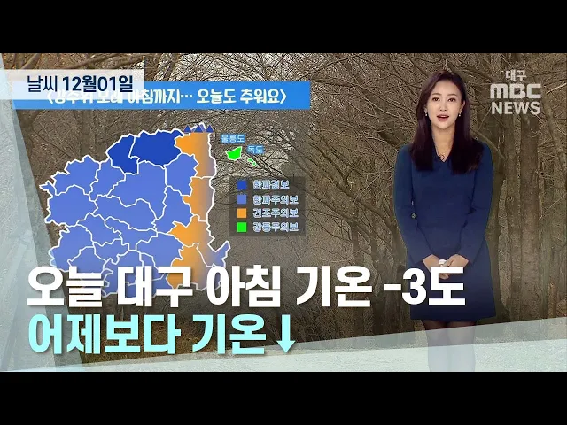 12월 1일 대구·경북은 가끔 구름 많은 가운데 30일보다 기온이 더 내려가 매우 춥겠습니다.영주와 봉화 등 경북 북동 산지에는 한파경보, 대구와 경북 나머지 지역에는 한파주의보가 발효됐고, 동해안에는 건조주의보가 내렸습니다.아침 최저기온은 대구 영하 3.7, 문경시 동로면 영하 9.8, 안동 영하 6.1, 포항 영하 1.9도...