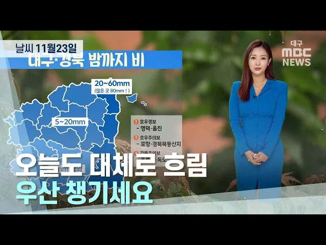 11월 23일 대구·경북은 오전까지 가끔 비가 내리겠습니다.22일부터 많은 비가 내린 경북 동해안에는 저녁까지 비가 내리는 곳이 있겠습니다.울진은 22일 하루 146.7mm, 영덕은 108.4mm의 비가 내려 11월 하루 최대 강수량 기록을 경신했습니다.23일도 경북 동해안과 북동 산지는 20에서 60mm, 북부 내륙과 울릉도·독도는 5...