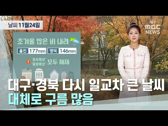 11월 24일 대구·경북은 구름이 많다가 오후부터 차차 맑아지겠습니다.아침까지 경북 북부내륙을 중심으로 가시거리 200mm 미만의 짙은 안개가 끼는 곳이 있겠습니다.목요일 아침 최저기온은 대구 5.1, 안동 2.0, 포항 8도로 전날보다 6도에서 8도 가량 떨어졌습니다.낮 최고기온은 대구 16도 등 14도에서 17도로 수요일보다...