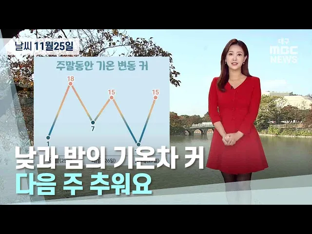 이제 본격적인 초겨울 추위가 시작되겠습니다.11월 25일 대구의 기온 1도로 24일보다 2~3도가량 낮게 시작해서요. 낮에는 18도까지 기온 껑충 올라 일교차가 크겠습니다. 26일 오후부터는 북서쪽에서 찬 공기가 남하하면서 기온이 큰 폭으로 낮아지겠는데요. 27일 대구의 아침 기온은 -1도, 경상북도 대부분 지역에서도 아...