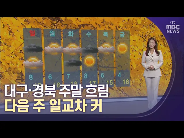 막바지 단풍의 대표주자 은행잎이 노랗게 가득합니다. 아름다움을 가지가지마다 뽐내고 있는데요. 이번 주는 큰 추위 없이 비교적 무난한 날씨가 이어졌습니다. 다만 낮과 밤의 기온 차가 컸는데요. 다음 주에도 일교차가 크게 벌어질 전망입니다.특히 다음 주 월요일 대구의 아침 기온은 6도로 시작해서요. 낮에는 18도로 ...