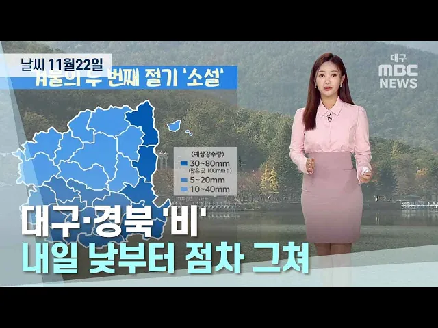 11월 22일은 ‘첫눈이 내리는 날’을 의미하는 절기 ‘소설’이지만, 우리 지역에는 '눈'이 아닌 '비'가 내리겠습니다.제주 남쪽 해상으로 이동하는 저기압의 영향으로 경북 동해안에는 22일 오전부터, 대구와 경북내륙 대부분 지역은 낮부터 비가 시작돼, 23일 낮부터 점차 그치겠습니다. 23일까지 예상 강수량은 경북 동해안...