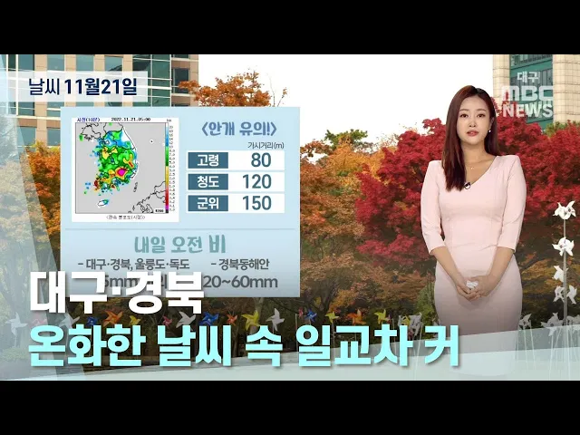 주말 동안 11월이 맞나 싶은 정도로 포근한 날씨가 이어졌습니다.포근했던 낮 기온이 밤사이 떨어지면서 현재 안개가 끼어 있는 곳이 많은데요. 특히 경북 내륙을 중심으로는 고령의 가시거리 80m, 청도 120m, 군위도 150m로 가시거리가 좁혀져 있는 곳이 많습니다. 11월 21일 오전까지는 차간거리를 넉넉히 두시고 안전 운...