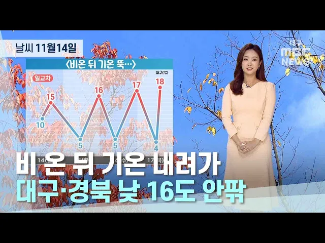 주말 동안 비가 내리더니 기온이 낮아졌습니다.북서쪽에서 찬 공기가 남쪽으로 이동하면서 11월 13일보다 더 추워졌는데요. 13일과 15일은 14일보다 기온이 더 내려갈 전망입니다. 14일 대구의 아침 기온 10도, 15일은 5도로 기온 뚝 떨어지겠고요. 그 외 경북 대부분 지역도 아침 기온 영하권 보이며 당분간 쌀쌀하겠습니...