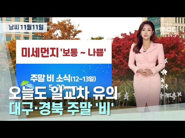 11월 11일 대구와 경북은 가끔 구름이 많겠습니다. 경북 북부 동해안에는 오전에 빗방울이 떨어지는 곳이 있겠습니다.11일 아침 최저기온은 대구 6.9, 안동 5.5, 포항 10도로 10일과 비슷하거나 조금 높았습니다.낮 최고기온은 대구 21도 등 19도에서 22도까지 오르겠습니다.주말인 12일은 늦은 오후부터 비가 시작돼 일요...