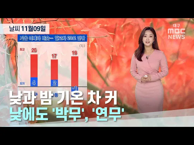 11월 9일 대구 경북은 대체로 맑겠습니다. 오전까지 안동과 고령, 구미 등 경북 내륙 일부 지역에 짙은 안개가 끼는 곳이 있겠습니다.9일 아침 최저기온은 대구 3.8, 안동 2.5, 포항 8.4도를 기록했습니다.낮 최고기온은 대구 20도 등 17도에서 22도까지 오르겠습니다.11월 11일까지 기온이 평년보다 1도에서 5도 높겠고 당...