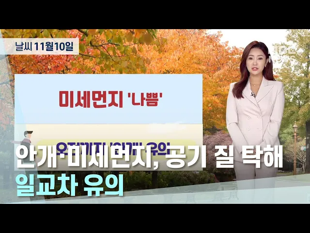 11월 10일 대구와 경북은 가끔 구름이 많겠습니다. 오전까지 가시거리 1km 미만의 안개가 끼는 곳이 있겠고, 낮 동안에도 엷은 안개나 먼지 안개가 끼는 곳이 있겠습니다.미세먼지 농도는 대구와 경북 모두 '나쁨' 수준을 보이겠습니다.오늘 아침 최저기온은 대구 5.3, 안동 2.2, 포항 10.8도로 어제보다 조금 높았습니다....